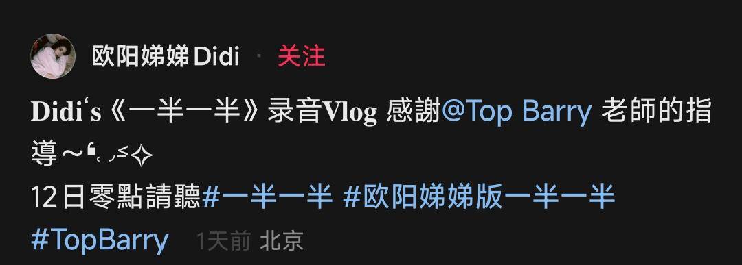 欧阳娣娣表示感谢Top Barry老师指导,预告新版《一半一半》将于12日零点发布!